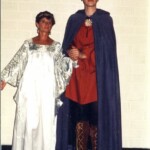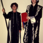 April 5: “The Presentation of the Book of Iff to the College at Caithnard” was created by me and Deb Jones for the Mythcon 16 masquerade in 1985, when Patricia McKillip was the author Guest of Honor. Deb was the Morgul of Herun; I was her heir and bodyguard Lyra. This was the beginning of a black and silver color theme that we revisited a few more times, and another adaptation of a Folkwear pattern, same one by both of us (the Tibetan Panel Coat). That is not a real spear; I fashioned it from a piece of lead I found in the lab.