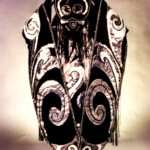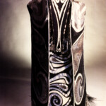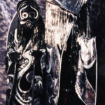 April 9: “Ghosts in the Machine” was our black and silver extravaganza for the SF&F masquerade at Costume Con 8 (1990). It’s inspired by Melanesian tamate dance costume and Pacific Northwest tribal designs, as reimagined by a race of robots. And The Police, although we did not use their music for the presentation, but that of Vangelis. We included — I think for the first time — a detailed documentation writeup of our design process as part of the entry form. Many thanks to Michael Jhon, whose photographic creativity went way beyond the usual official con pix.